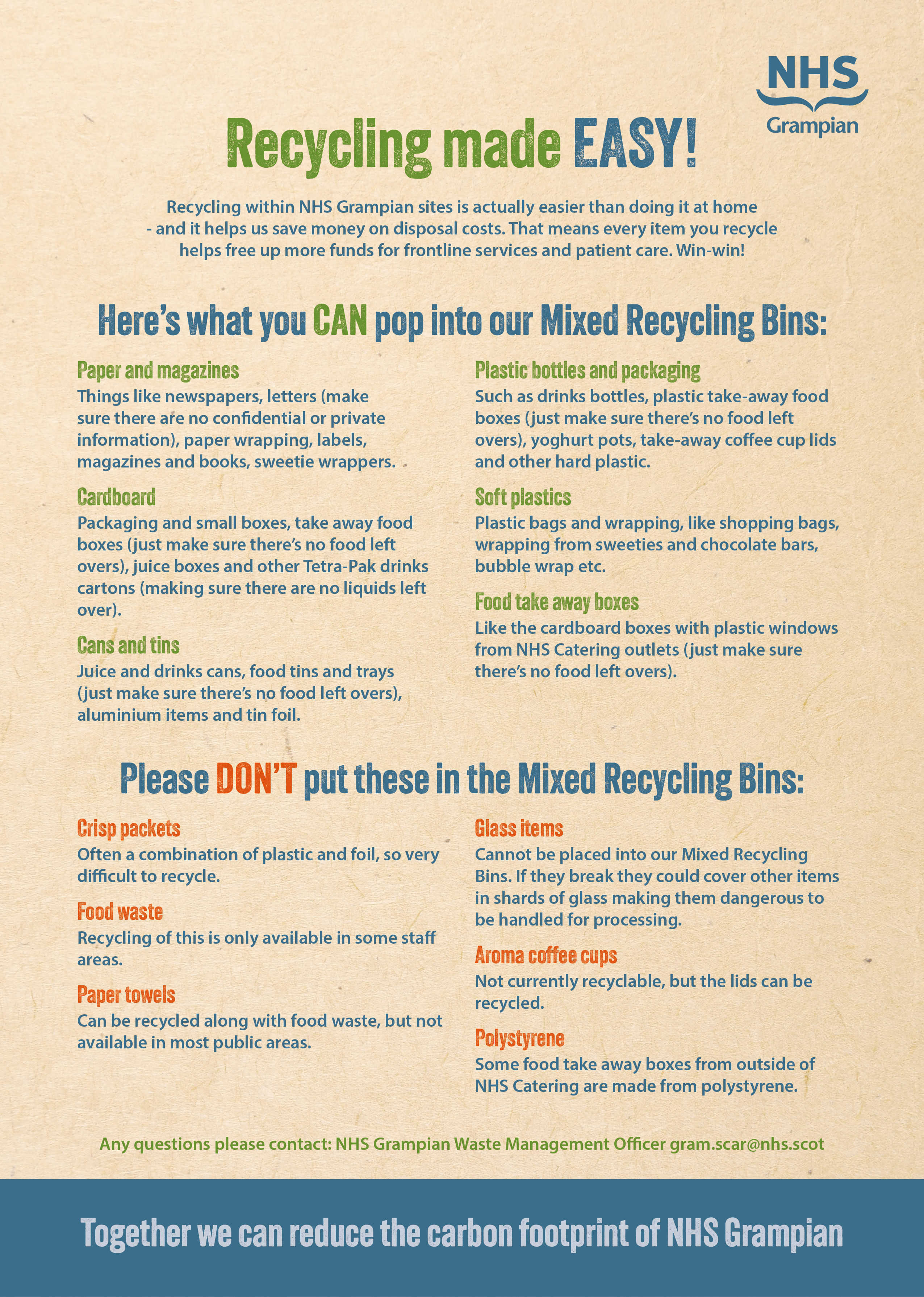 Recycling within NHS Grampian sites is actually easier than doing it at home - and it helps us save money on disposal costs. That means every item you recycle helps free up more funds for frontline services and patient care. Win-win!